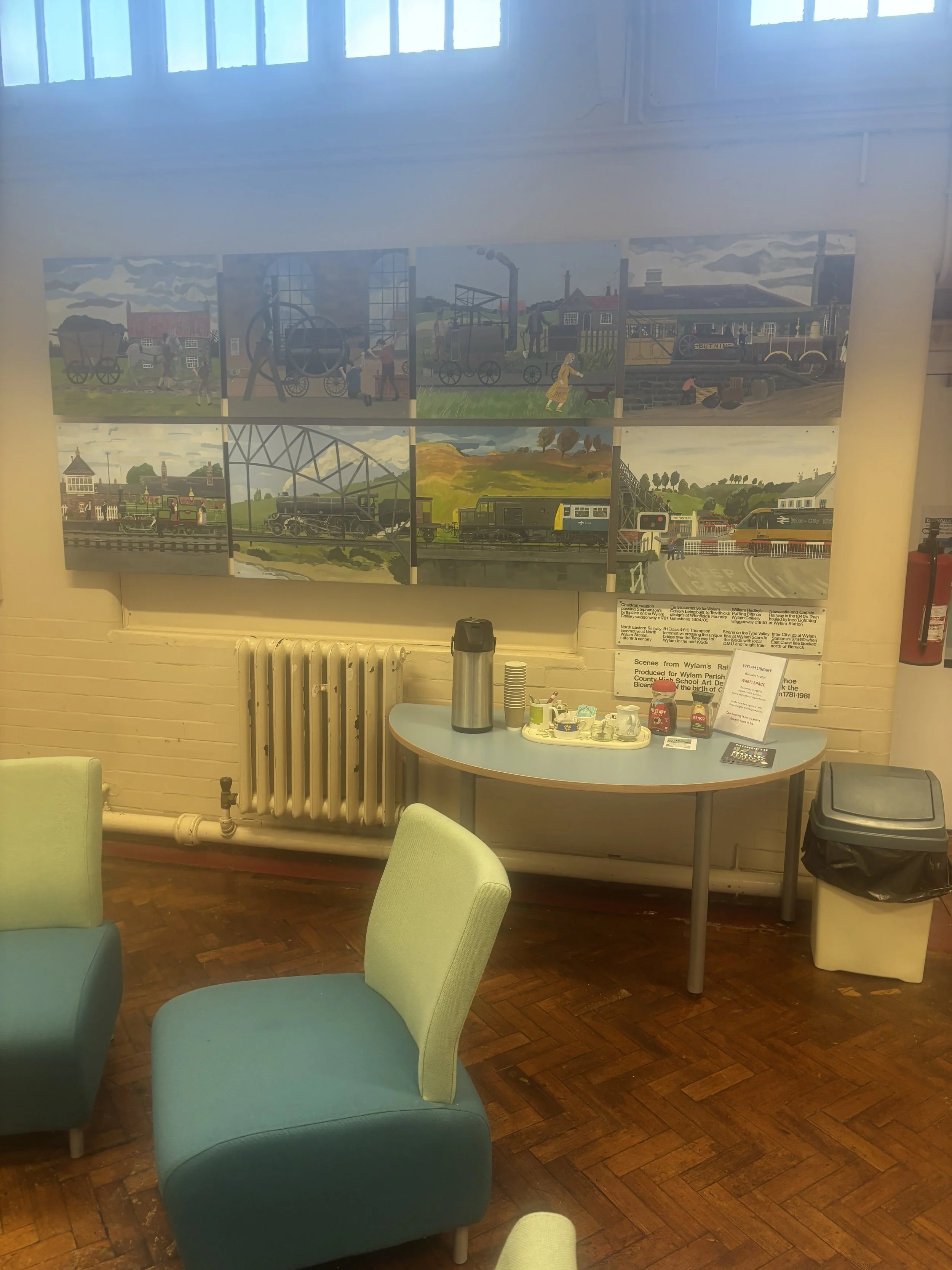 Parking is easy at the Tyne Riverside Country Park in Wylam and from there it’s a short walk to the old Waggonway, with the River Tyne to the South and the gentle uplands of the valley to the north. Soon you came to the cottage where George Stephenson was born in 1781. From here it is a lovely walk on to Newburn and beyond but if you retrace your steps to the car park and head west into Wylam village you come to the unmistakable shape of an Edwardian school (1910) built to replace the Colliery School (1850). Repurposed now as the Falcon Centre since the school closed in the 1970s it is a little unsettling to see the padlocked gates and the weeds growing through the tarmac playground. Is this some sort of rural blight? Up a little lane there is an open gate and, in a corner, an open door to the building. Suddenly, warm and bright you are in the Falcon Centre. Friendly faces come and go to the welcoming space of an attractive small library where a comfortable seating area offers the opportunity to make a cuppa and ‘take the weight off.
